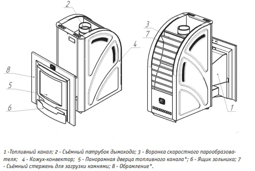 Топка выполнена из из жаростойкой нержавеющей стали толщиной до 2 мм с содержанием хрома до 13%. Топливный канал позволяет топить печь из смежного помещения. Камни в наклонной каменке надёжно закреплены металлическими прутьями-фиксаторами.