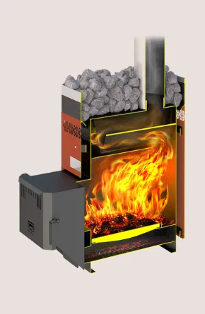 Особая конструкция нагревательных поверхностей обеспечивает умеренный нагрев парной до 90°С, в сочетании с отличным прогревом большой массы камней позволяет получить настоящую печь для русской бани. Печи с выносным топливным каналом, могут топиться из смежного помещения.