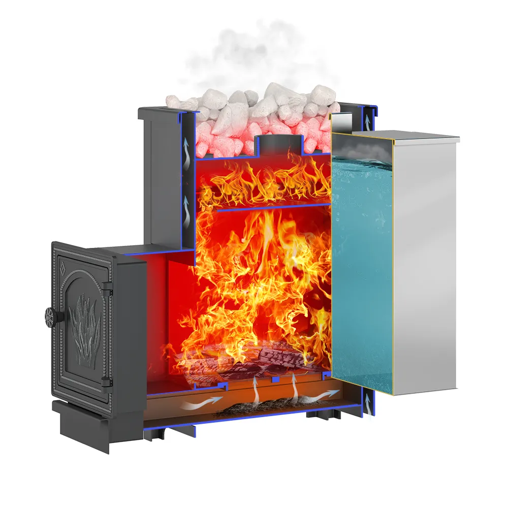 Воздух для горения дров поступает из нижней части печи через чугунный колосник. Регулирование интенсивности горения происходит путем закрывания или открывания зольного ящика. Конструкция топки позволяет максимально использовать энергию горения дров и нагревать воду без ущерба для парообразования.