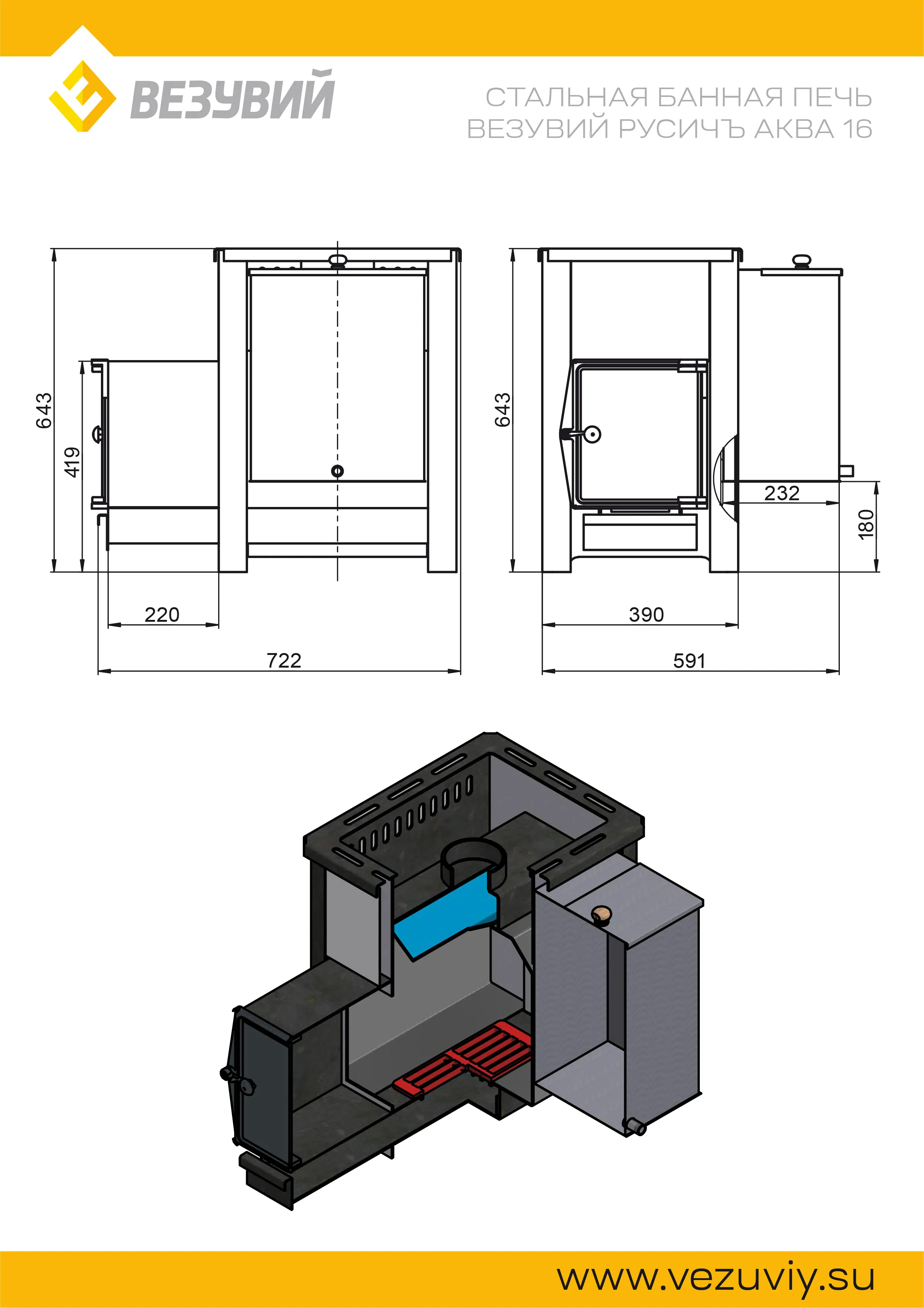 Русичъ «АКВА» 16 (ДТ-4) – стальная банная печь с баком для нагрева воды (бак в комплект НЕ входит). Конструкция печи позволяет нагревать и использовать воду прямо во время парения. Русичъ Аква сделана из особо прочной котловой стали 09Г2С толщиной от 6 до 8 мм. Стальная топка оборудована дверцей ДТ-4 из чугуна. Объём топки позволяет быстро и качественно нагреть парилку и одновременно получить достаточное количество горячей воды.