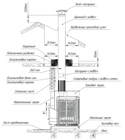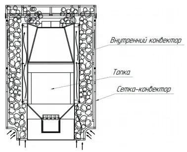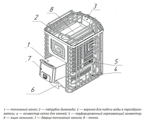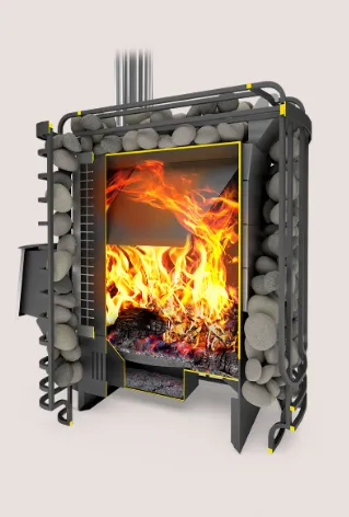 Топка печи выполнена из 4мм высоколегированной стали с содержанием хрома не менее 17%. Термически нагруженные элементы печей для бани изготавливаются из стали с содержанием хрома до 17%. Печи оборудованы встроенным парообразователем для получения пара с раскалённых стенок топки печи