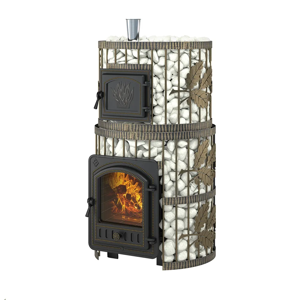 Каменка рассчитана на размещение 170-180 кг чугуна или 70-80 кг камня для бани, создаёт массивный тепловой заряд. Внешний корпус изготовлен из чугуна, его части крепятся друг к другу по типу «паз-гребень» с использованием термостойкого герметика. В качестве открытой каменки выше основной части печи может быть размещён стальной поддон для камней, куда умещается более 60 кг камня. Совокупный вес печи и чугунного заклада составляет более 400 кг. Подача пара в каменку производится через дверку, распложенную на одной из сторон каменки. Парогенератор открытой каменки укладывается между камнями в верхнем поддоне. Чугунная дверка артикул 290 специально разработана для этой печи, обеспечивает регулировку подачи воздуха в широких пределах и безопасность использования печи, не деформируется при длительном нагреве.