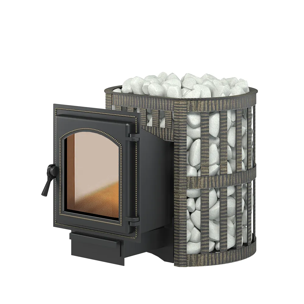 Банная чугунная печь Легенда Ковка 12 (220) укомплектована чугунной герметичной дверцей с жаропрочным стеклом «SCHOTT ROBAX». Конвекционно-вентилируемый кожух "Ковка" изготовлен из металлической текстурированной полосы покрашенной термостойкой краской и покрытая патиной «Бронза».
