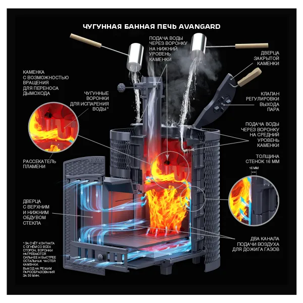 Полностью чугунная закрытая каменка печи Авангард - является основным парообразователем. Она раскаляется до 900 градусов и при попадании на неё воды способна бесконечно давать большой объем мелкодисперсного легкого пара.