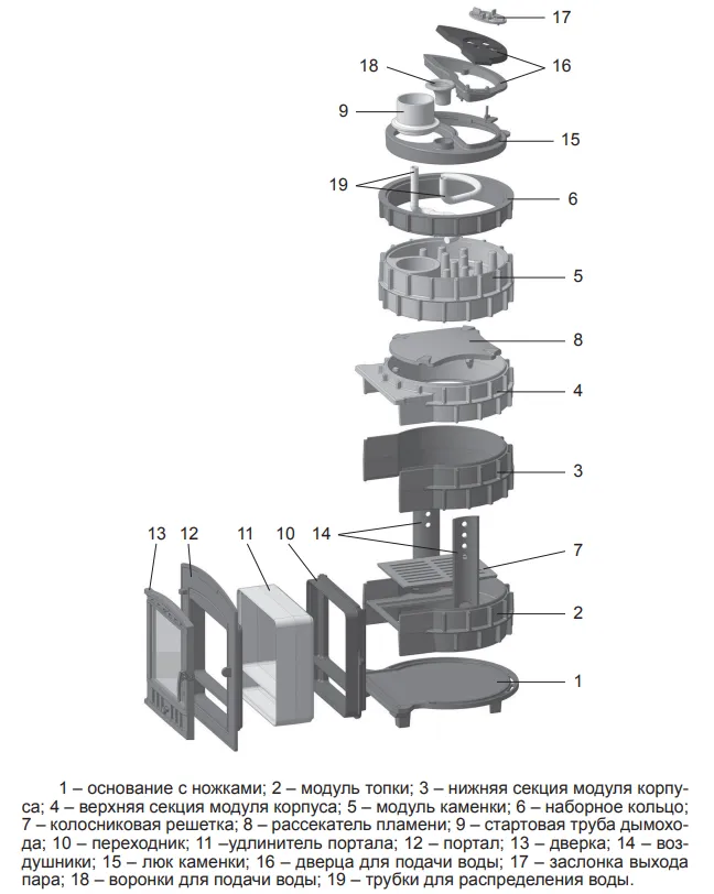 Под каменкой на 3-х упорах установлен рассекатель пламени, он разделяет пламя на 3 потока и направляет сначала на боковые части корпуса для интенсивного нагрева стенок и конвекционного нагрева воздуха в парной. Для этого на наружных поверхностях расположены конвекционные рёбра. Дальше пламя проходит через выступы к выходу в дымоход, нагревая каменку. Каменка позволяет устанавливать различные стартовые модули Гефест вместе с шиберным блоком.