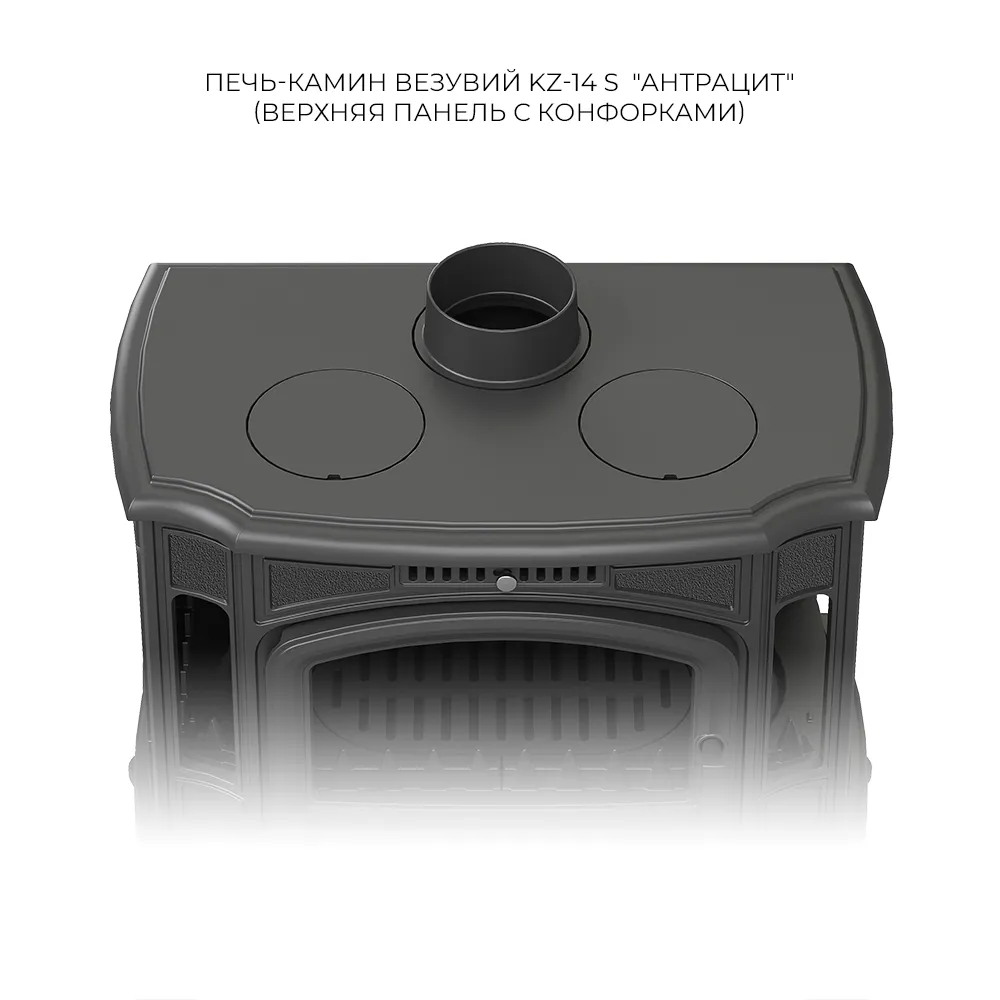 Печь-Камин Везувий KZ-14S Антрацит изготовлена из качественного чугуна с толщиной стенки 8-10 мм. Модель рассчитана на обогрев помещений объёмом до 250 м³. Топочная камера ограничена двойными чугунными стенками сзади и по бокам. В нижней панели предусмотрена колосниковая решётка. Дверь изготовлена из чугуна и оснащена большим панорамным стеклом в виде арки. С двух сторон от двери установлены две стеклянные вставки. Чистота стекла во время работы обеспечивается системой подачи воздуха на внутреннюю сторону стекла.