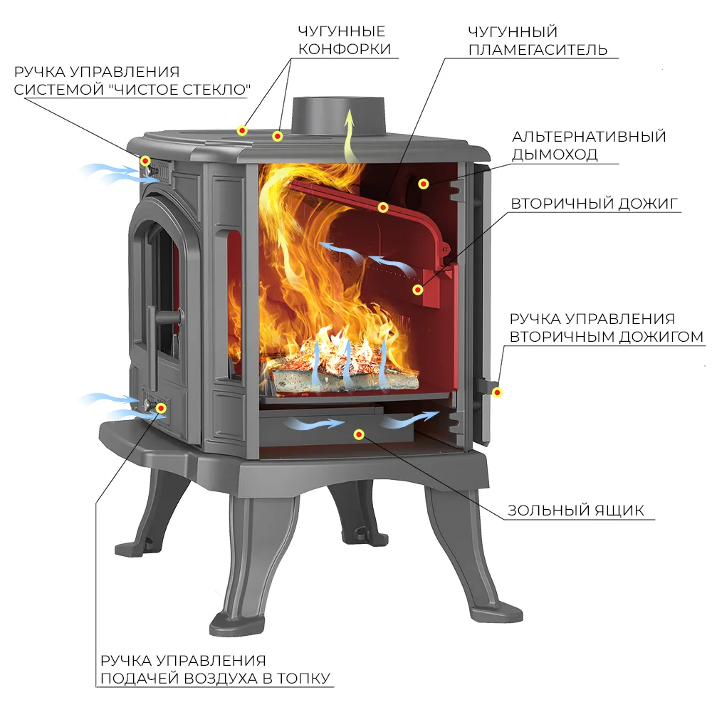 Воздух для вторичного дожига поступает в верхнюю часть топки, усиливая горение и повышая теплоотдачу. Вторичный дожиг регулируется заслонкой, расположенной на задней стенке печи-камина. Ручка управления заслонкой находится справа. Зольный ящик коробчатого типа изготовлен из стали и закрывает пространство под колосниковой решёткой.