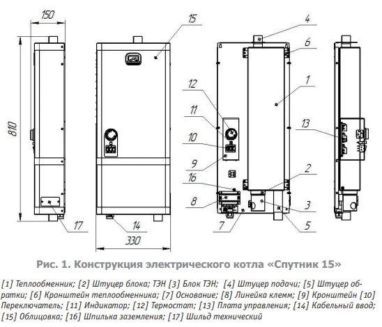 Конструкция электрокотла полностью исключает «завоздушивание». Электрические котлы Спутник-15 можно использовать для работы в трехфазной (380 В) сети переменного тока. В котлах установлен сменный блок из трёх ТЭНов изготовленных из нержавеющей стали суммарной мощностью 15 кВт.
