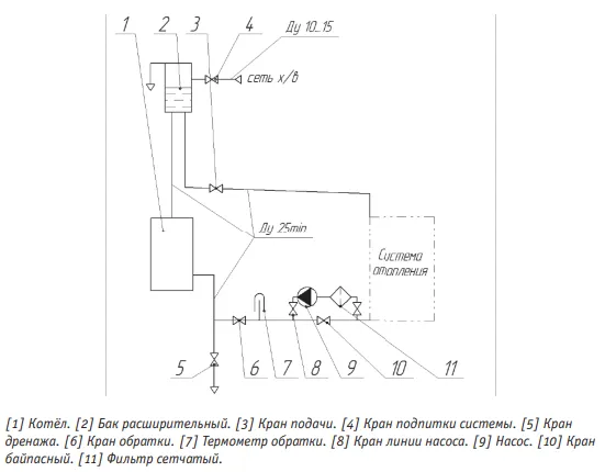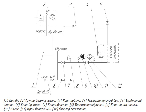 Рисунок 4. Схема подключения котла к открытой системе с принудительной циркуляцией теплоносителя