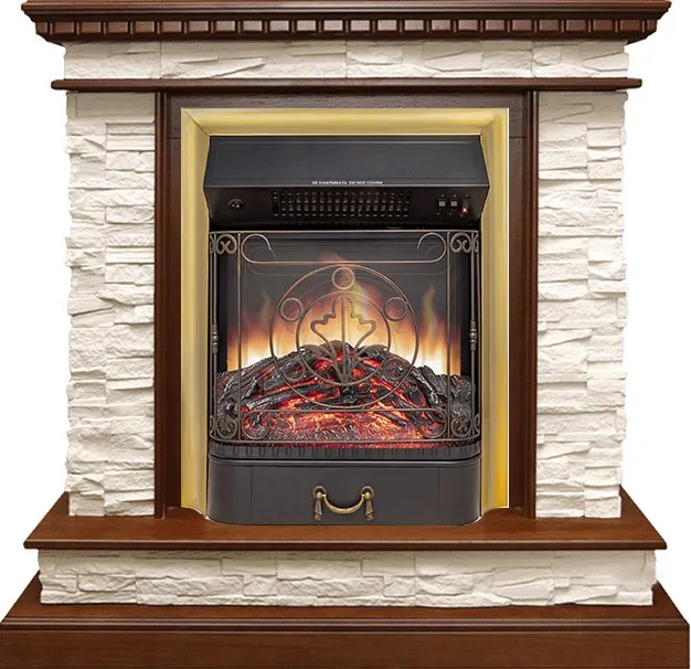 Каминокомплект Calgary - Дуб / Сланец бежевый с очагом Majestic FX M Brass