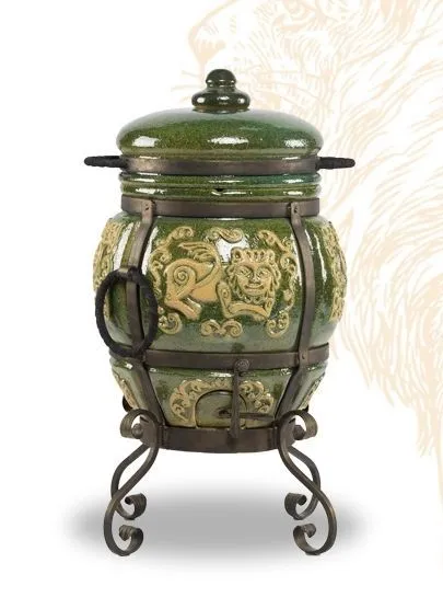 Тандыр покрыт глянцевой глазурью с орнаментом. Ручки – натуральная кожа.