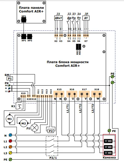 Пульт управления электрокаменками «Comfort AIR+» предназначен для управления режимами работы блока ТЭН электрокаменок. Пульт управления поддерживает заданную температуру в парильном помещении, путем контроля включения/отключения ТЭНов, имеет возможность аварийного отключения электрокаменки в случае превышения температуры воздуха в парильном помещении, а также поддерживает заданную влажность воздуха в парной (при наличии пароиспарителя в конструкции электрокаменки).