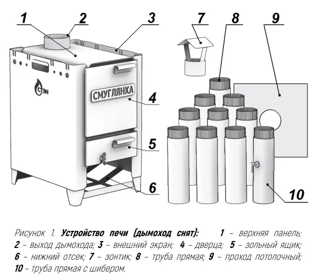 Печи комплектуются съёмным разборным дымоходом. На печах «СМУГЛЯНКА» можно готовить и разогревать пищу.