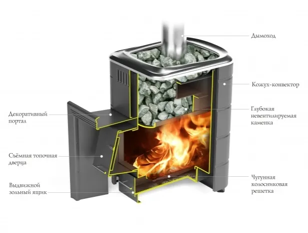 Довольно сложная и эффективная конструкция внутренней невентилируемой каменки печи полностью заимствована из отлично зарекомендовавшей себя газовой печи «Уренгой 2018».