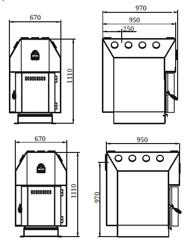 Внешний дизайн печей выполнен в цвете «антрацит». Модификации печей различаются комплектацией: стальная или чугунная дверца со стеклом, выход дымохода вверх или назад. Линейка твердотопливных конвекционных печей идеально подходит для воздушного отопления жилых помещений, гаражей, теплиц, ангаров и так далее.