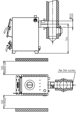 особая конструкция кожуха котла создает конвективные потоки теплого воздуха, достаточного для обогрева 15 м2 возле котла (Внимание! Это не делает котел воздухогрейной печью!)
