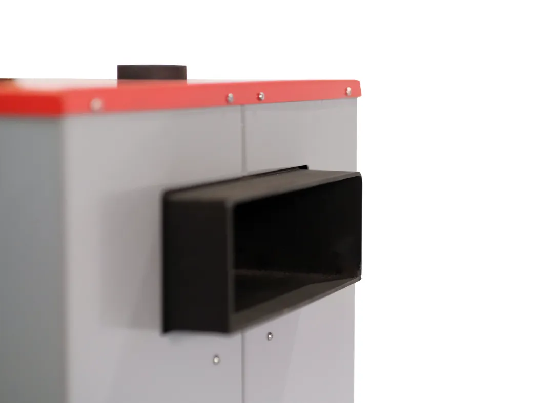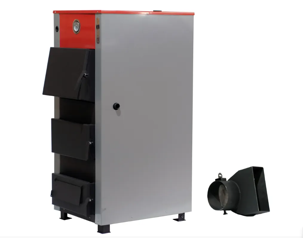 Котел имеет в комплекте автоматический регулятор тяги, который позволяет в автоматическом режиме поддерживать комфортную температуру теплоносителя. Данный котел подходит для закрытой системы отопления. В него добавлена дополнительная дверца в топочной камере, позволяющая загружать твердое топливо и очищать дымовые каналы от сажи