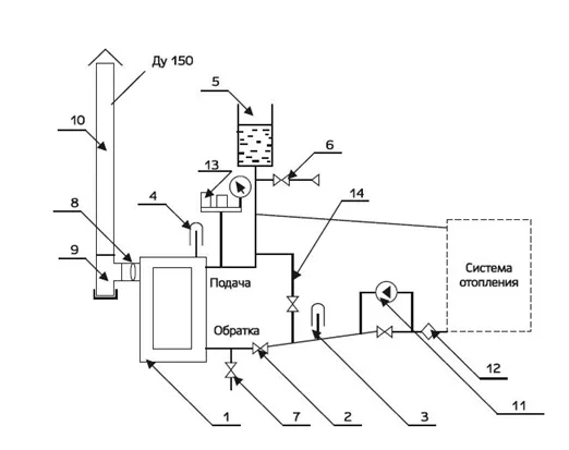 1 – котел; 2 – кран обратки; 3 – термометр обратки; 4 – термометр на подаче; 5 – бак расширительный открытого типа; 6 – кран подпитки системы водой; 7 – кран дренажа; 8 – шибер поворотный; 9 – тройник ревизия; 10 – дымоход; 11 – насос; 12 – фильтр сетчатый; 13 – группа безопасности 0,25 МПа; 14 – обводной мостик.