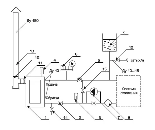 1 – котел; 2 – кран обратки; 3 – термометр обратки; 4 – термометр на подаче; 5 – кран подачи; 6 – группа безопасности 1 МПа; 7 – насос; 8 – фильтр сетчатый; 9 – бак расширительный закрытого типа; 10 – кран подпитки системы водой; 11 – шибер поворотный; 12 – тройник ревизия; 13 – дымоход; 14 – кран дренажа; 15 – обводной мостик.