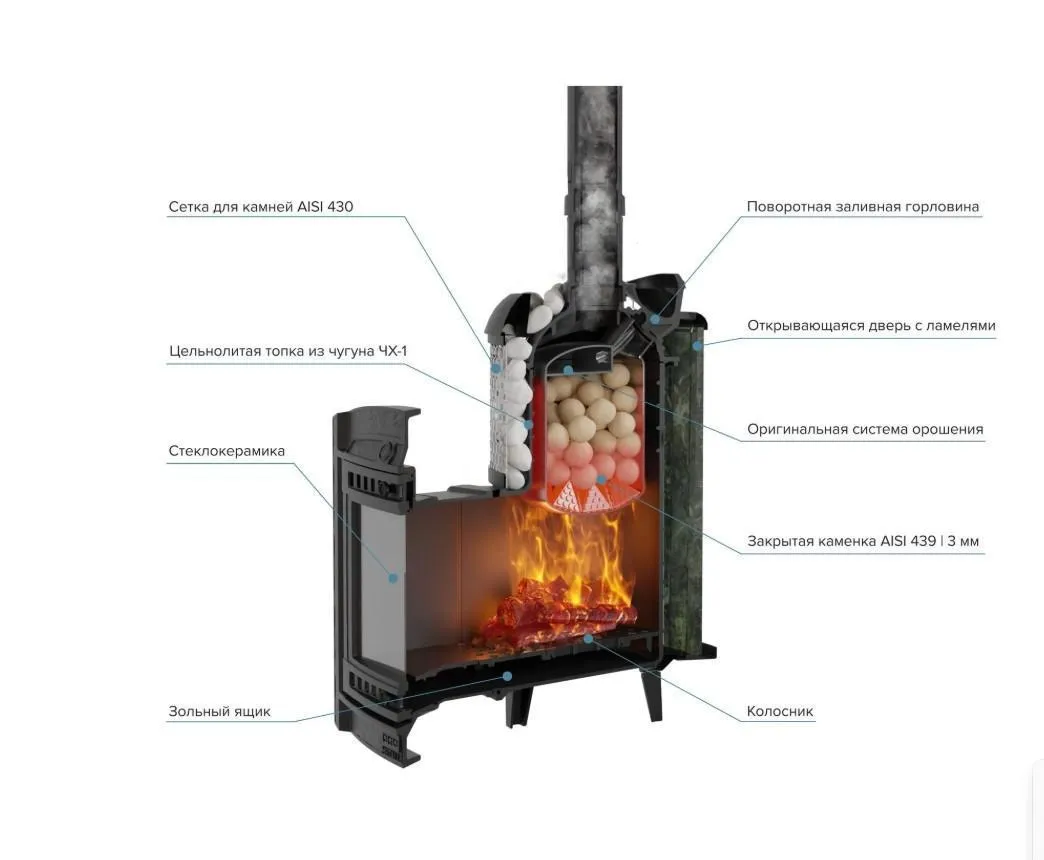 Производитель из России ПроМеталл позаботился о надежности конструкции, оснастив агрегат тремя устойчивыми ножками и защитными элементами. Жаропрочное стекло толщиной 4 мм позволяет пользователю следить за процессом сгорания топлива, при этом наслаждаясь красотой пламени. Пламя закручивается внутри топочной камеры в три оборота благодаря винтовым каналам, что повышает коэффициент полезного действия изделия на 30% по сравнению с аналогичными моделями на рынке.