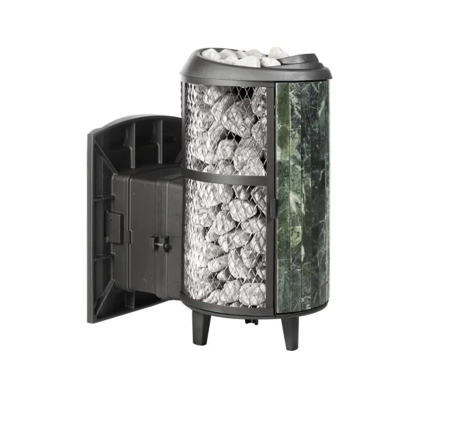 Особенностью модели является открывающаяся дверь с ламелями. Только натуральный камень закрывает металлическую часть печи, делая её безопасной
