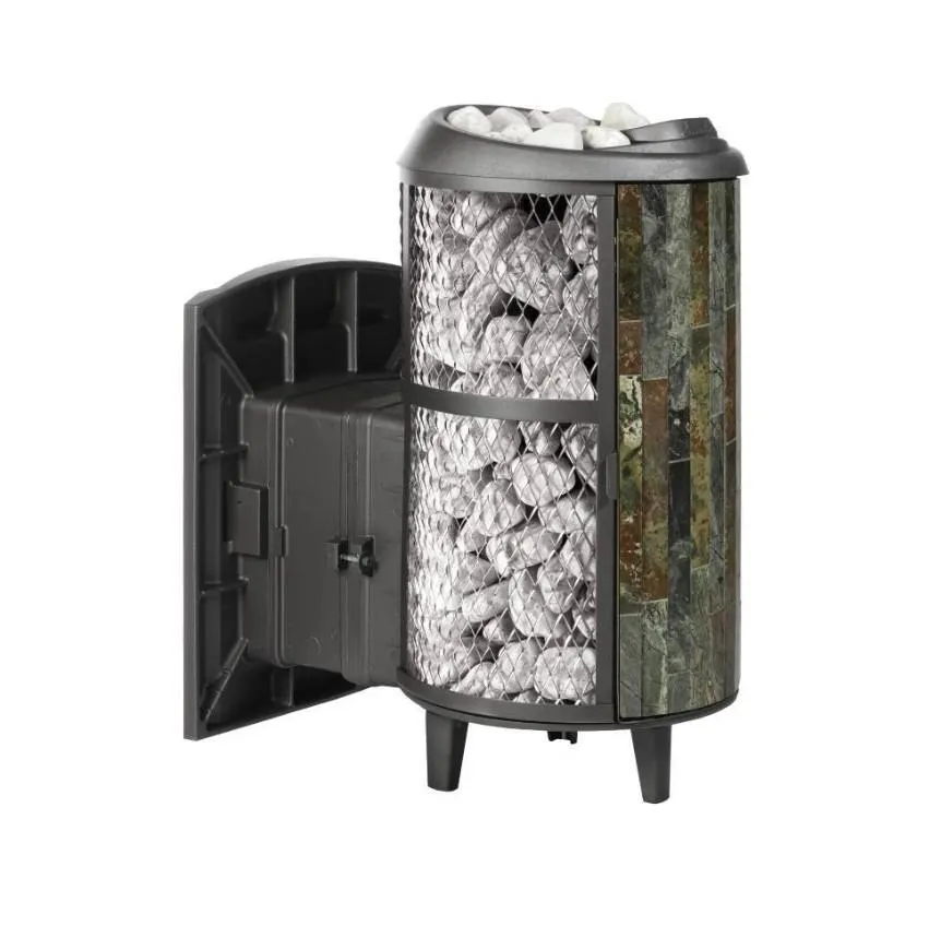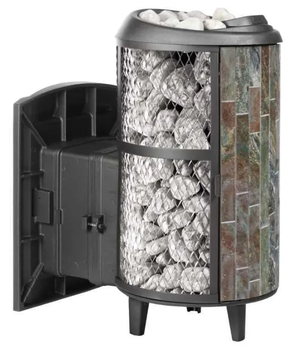 Особенностью модели является открывающаяся дверь с ламелями. Только натуральный камень закрывает металлическую часть печи, делая её безопасной