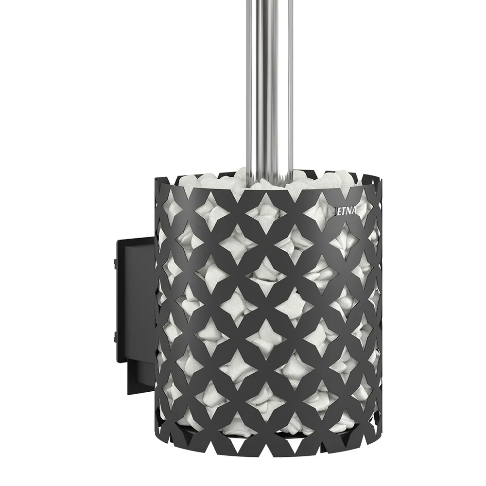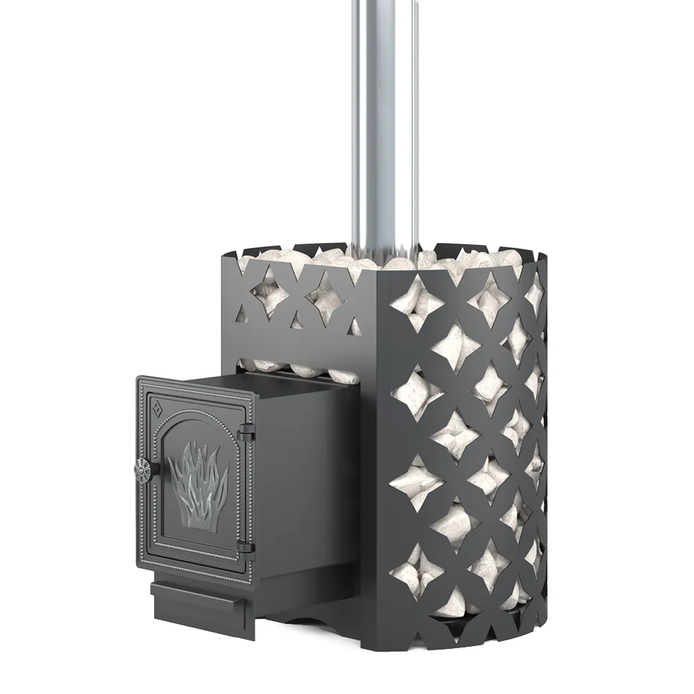 Дверка ДТ-4 имеет квадратную форму и оснащена глухой чугунной створкой. Ручка двери при закрывании плотно притягивает полотно дверки к рамке, что предотвращает попадание дыма и горящих газов в помещение. Для устройства наружной открытой каменки печь ЭТНА 18 (ДТ-4) оснащается металлическим кожухом с прорезным рисунком оригинального дизайна. Пространство между печью и кожухом заполняется камнями для бани, которые перераспределяют тепло от стенок топки и защищают парящихся от жёсткого инфракрасного излучения. Воду подают на нагретые камни, с которых полученный пар распространяется по всему объёму парной.