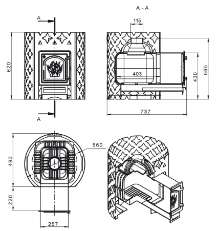 Корпус печи состоит из трёх элементов, собираемых на болтовых соединениях. При сборке между элементами корпуса прокладывается термостойкий керамический шнур, предотвращающий прорыв дымовых газов и пламени в помещение. В нижней части топочной камеры размещается чугунный колосник, предназначенный для подачи воздуха на дрова снизу. Для повышения теплоотдачи и максимального использования энергии горения дров в верхней части печи расположен пламегаситель, изменяющий направление движения дымовых газов и обеспечивающий полное сгорание. Чугунная деталь перекрывает прямой путь пламени и газов в дымоход, что улучшает тепловые показатели.