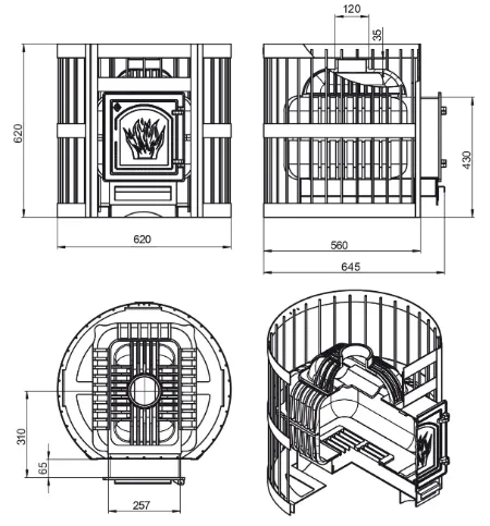 Корпус печи состоит из трёх элементов, собираемых на болтовых соединениях. При сборке между элементами корпуса прокладывается термостойкий керамический шнур, предотвращающий прорыв дымовых газов и пламени в помещение. В нижней части топочной камеры размещается чугунный колосник, предназначенный для подачи воздуха на дрова снизу. Для повышения теплоотдачи и максимального использования энергии горения дров в верхней части печи расположен пламегаситель, изменяющий направление движения дымовых газов и обеспечивающий полное сгорание. Чугунная деталь перекрывает прямой путь пламени и газов в дымоход, что улучшает тепловые показатели.