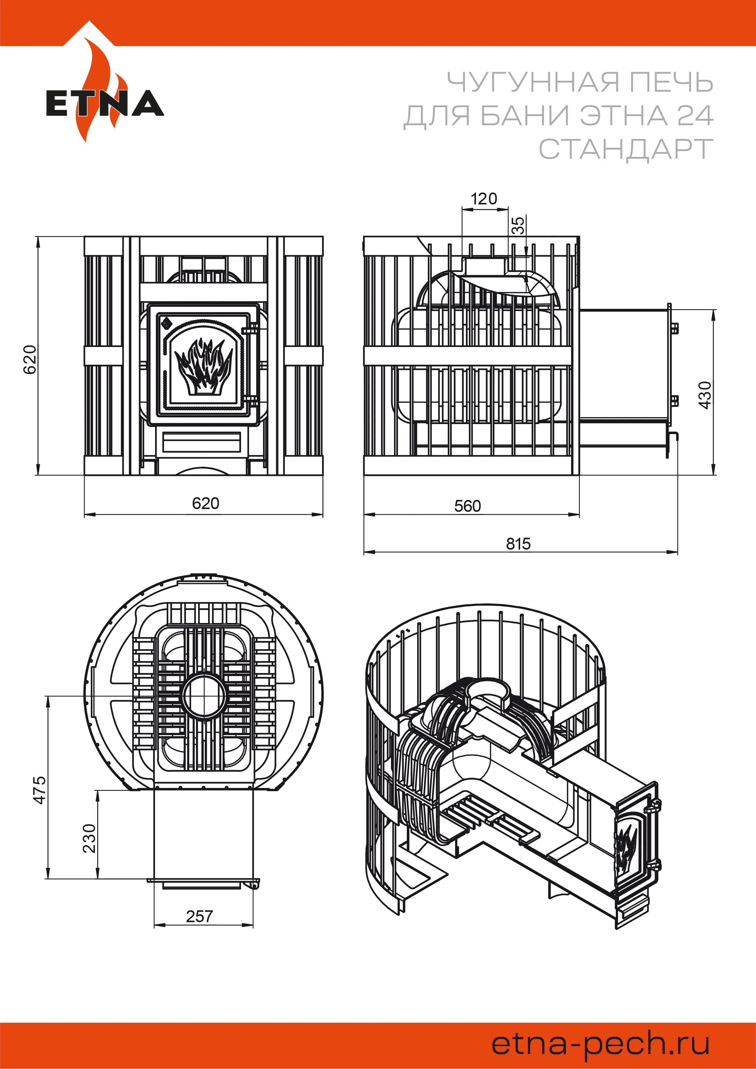 Чугунная банная печь ЭТНА 24 (ДТ-4С) оснащается остеклённой чугунной дверкой ДТ-4С и рассчитана на работу в парной объёмом до 24 кубических метров. С помощью этой модели обеспечивается быстрый равномерный прогрев парной, поддержание необходимой температуры и получение достаточного количества пара. Банная печь ЭТНА 24 (ДТ-4С) изготовлена из жаростойкого чугуна (ГОСТ 1412-85) высокого качества. Материал с высокой теплопроводностью, чугун быстро передаёт энергию сжигаемого топлива наружу, в пространство парной. Толщина деталей корпуса составляет 6-8 миллиметров.