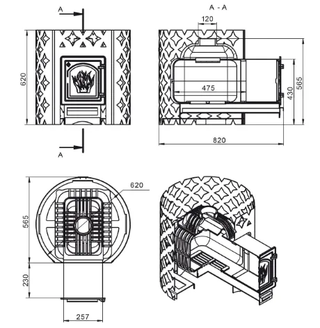 Дверка ДТ-4С имеет квадратную форму и оснащена стеклом на передней панели. Стекло изготовлено из керамического сплава, выдерживающего температурные нагрузки до 600 градусов при постоянном нагреве и хорошо переносящего кратковременные перепады температуры (например, попадание воды на стекло). Толщина стекла 4 миллиметра, пространство между стеклом и рамкой герметично заполнено термостойким шнуром. Для устройства наружной открытой каменки печь ЭТНА 24 (ДТ-4С) оснащается металлическим кожухом с прорезным рисунком оригинального дизайна. Пространство между печью и кожухом заполняется камнями для бани, которые выполняют роль теплонакопителя, перераспределяют тепло от стенок топки и защищают парящихся от жёсткого инфракрасного излучения. Воду подают на нагретые камни, с которых полученный пар распространяется по всему объёму парной.