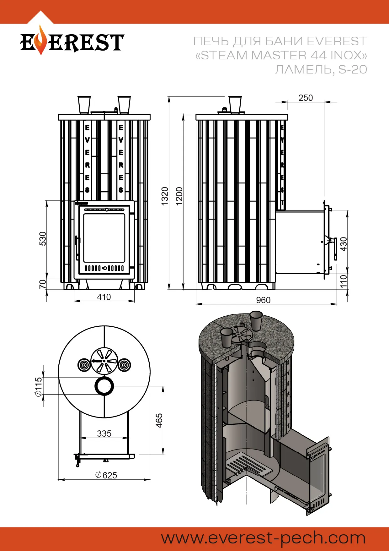 Печь для бани Эверест "Steam Master 44 INOX" Ламель Талькохлорит, S-20 изготовлена из нержавеющей стали. Печь предназначена для установки в частные и коммерческие бани с объёмами парных помещений до 44 кубических метров.