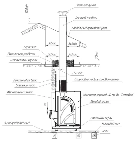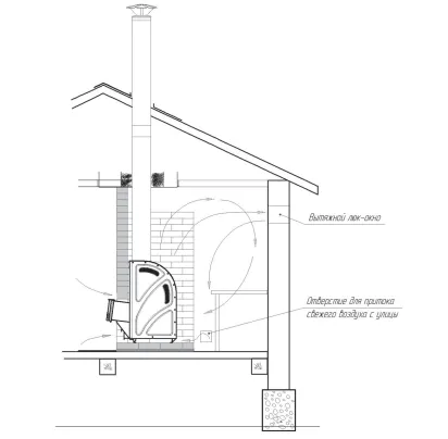 Смещённый к передней стенке печи выход дымохода обеспечивает удобный доступ к каменке, даже если бак установлен на выходе дымохода.