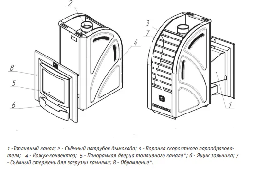 Печь Каскад выполнена из конструкционной стали толщиной до 5 мм. Топливный канал позволяет топить печь из смежного помещения. Камни в наклонной каменке надёжно закреплены металлическими прутьями-фиксаторами.