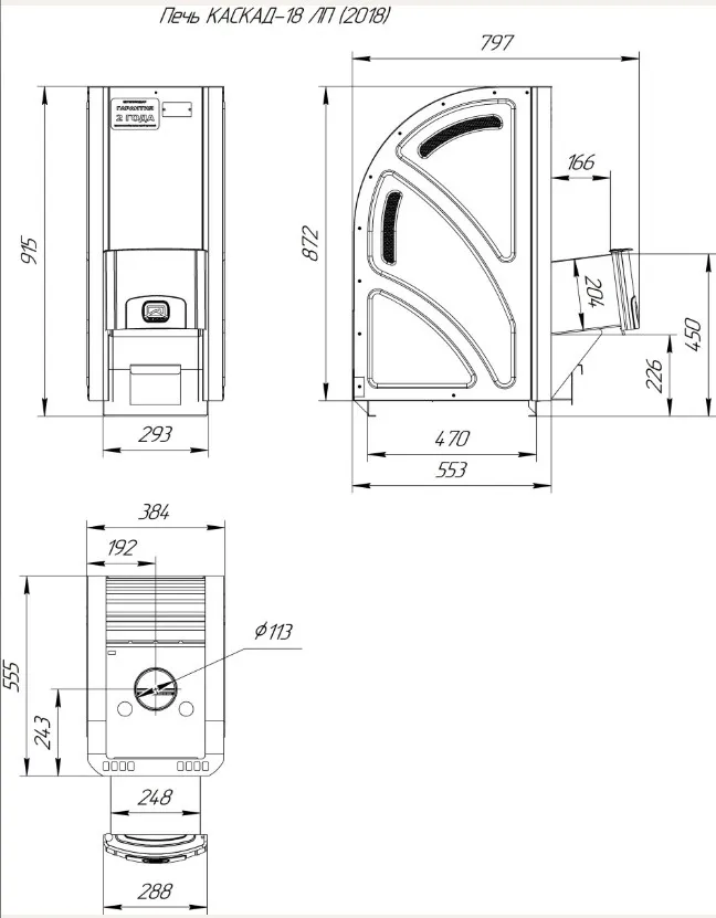 Дверца топливного канала - зеркальная, оригинального дизайна, со свойством самоохлаждения наружной панели. Так как топливный канал выполнен под наклоном то дверца всегда будет плотно закрыта тем самым исключая дымление печи. Печи Каскад 18 ЛП оборудованы встроенным парообразователем собственной разработки, который обеспечивает получение пара от стенок топки печи