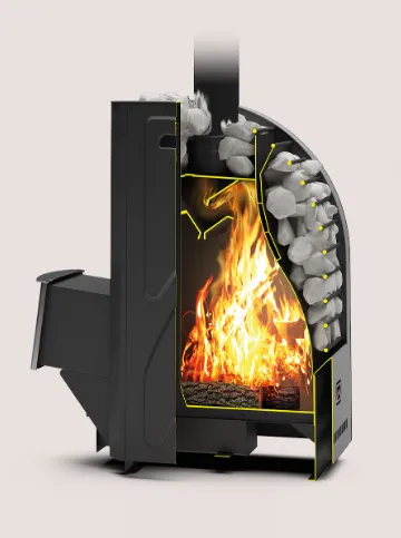 Топка выполнена из из жаростойкой нержавеющей стали толщиной до 2 мм с содержанием хрома до 13%. Топливный канал позволяет топить печь из смежного помещения. Камни в наклонной каменке надёжно закреплены металлическими прутьями-фиксаторами.