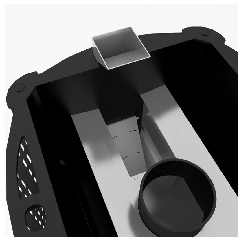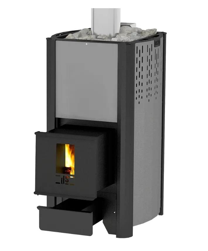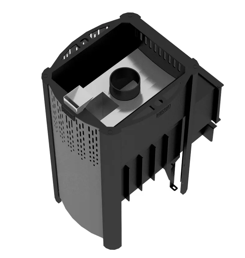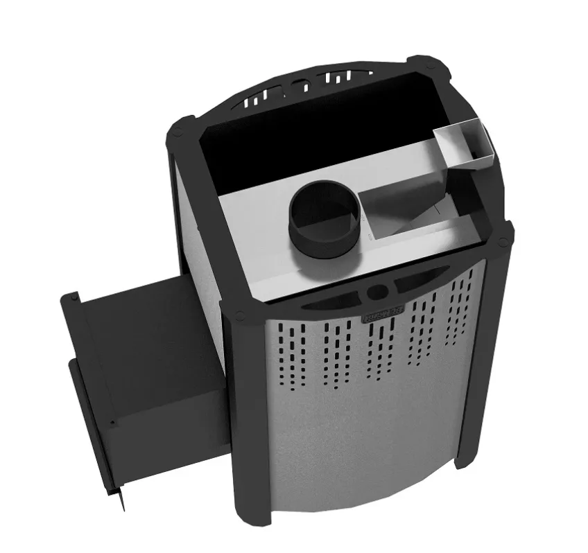 Несущие стенки топки с рёбрами жесткости и открытая вентилируемая каменка создана из котловой углеродистой стали, покрытой жаростойкой эмалью Certa. Рассекатель-отбойник пламени, встроенная камера каменки, крышка коллектора, канал подачи воды во встроенную каменку созданы из жаростойкой нержавеющей стали.