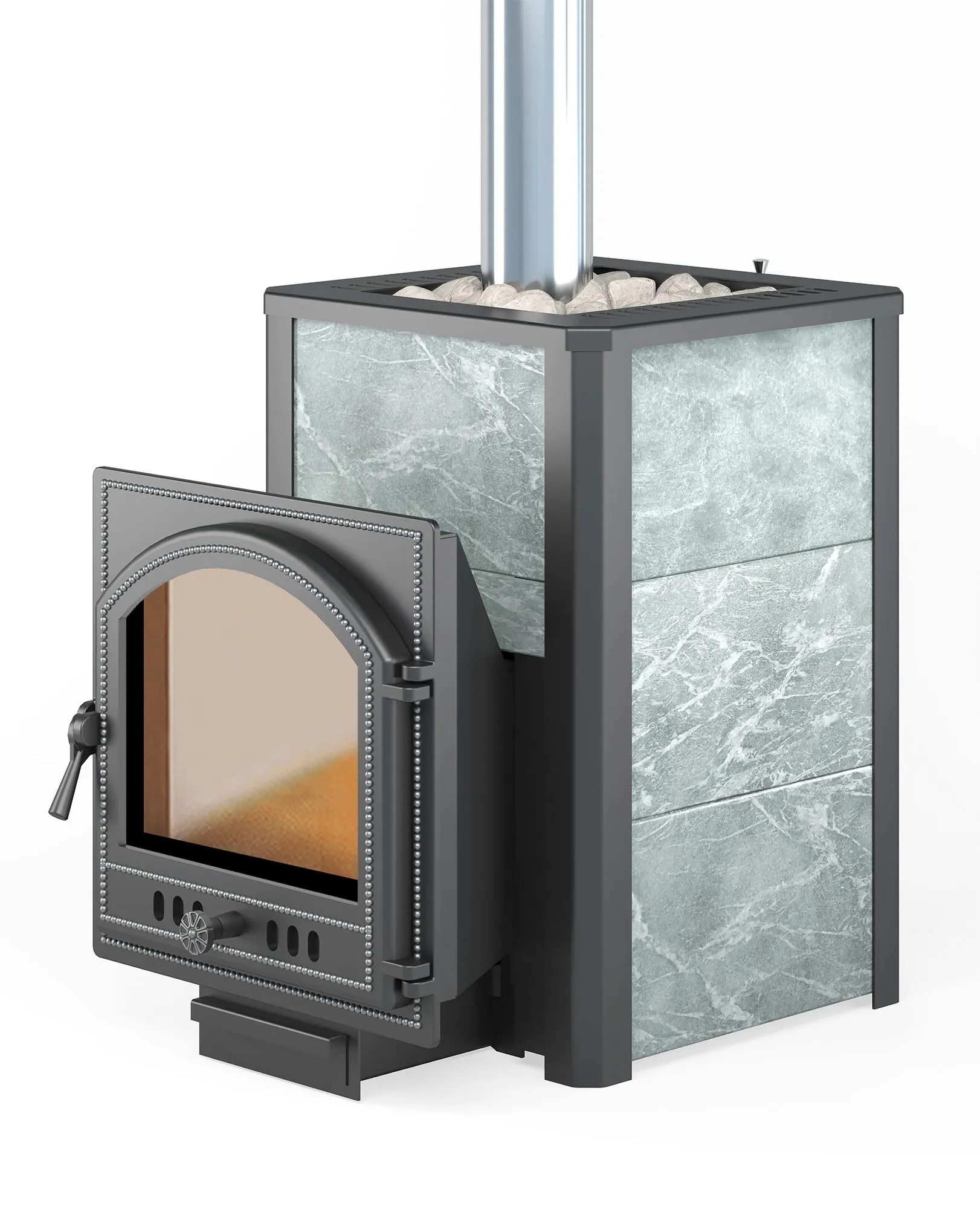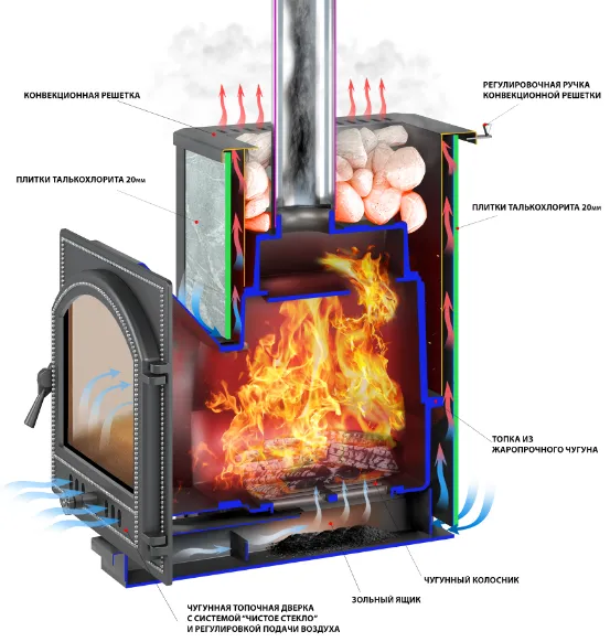 Преимущество печи в том, что топка печи состоит из 3-х чугунных элементов. На стыке между ними используется керамический шнур с рабочей температурой 1200 градусов. То есть топка печи абсолютно герметична! Для фиксации деталей между собой применяется болтовое соединение, что даёт 100% гарантию безопасности при эксплуатации. Теплоёмкая конвекционно–вентилируемая облицовка из экологически чистой горной породы позволяет камню в короткие сроки нагреваться и удерживать стабильную температуру в парильном помещении максимально долго, а также гасить жёсткое инфракрасное излучение.