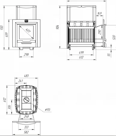 Печь комплектуется стальной дверцей с функцией самоохлаждения. На печи может быть установлен бак для нагрева воды «самоварного» типа или универсальный регистр-теплообменник для дистанционного нагрева воды, изготовленные из нержавеющей стали. Элементы дымохода и камни не входят в комплект печи и приобретаются отдельно.