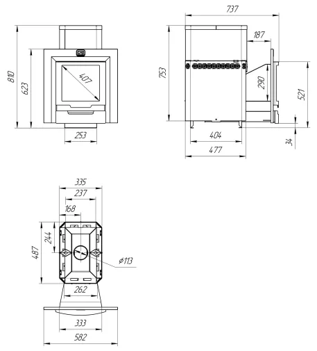 В корзине каменки камни выкладываются вокруг самого раскалённого элемента – дымосборника, - это обеспечивает качественный и равномерный прогрев камней. Большое количество нагретых камней, обеспечивает стабильность температуры в парилке. Выход дымовой трубы смещен от края к центру каменки, что значительно упрощает монтаж дымохода.