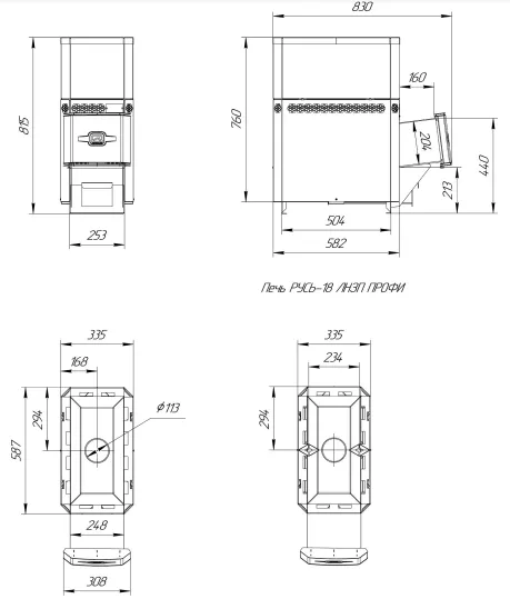 Топка печи Русь-18 Л Профи изготовлена из жаростойкой нержавеющей стали толщиной 4 мм с содержанием хрома до 17%. Элементы дымохода и камни не входят в комплект печи и приобретаются отдельно.