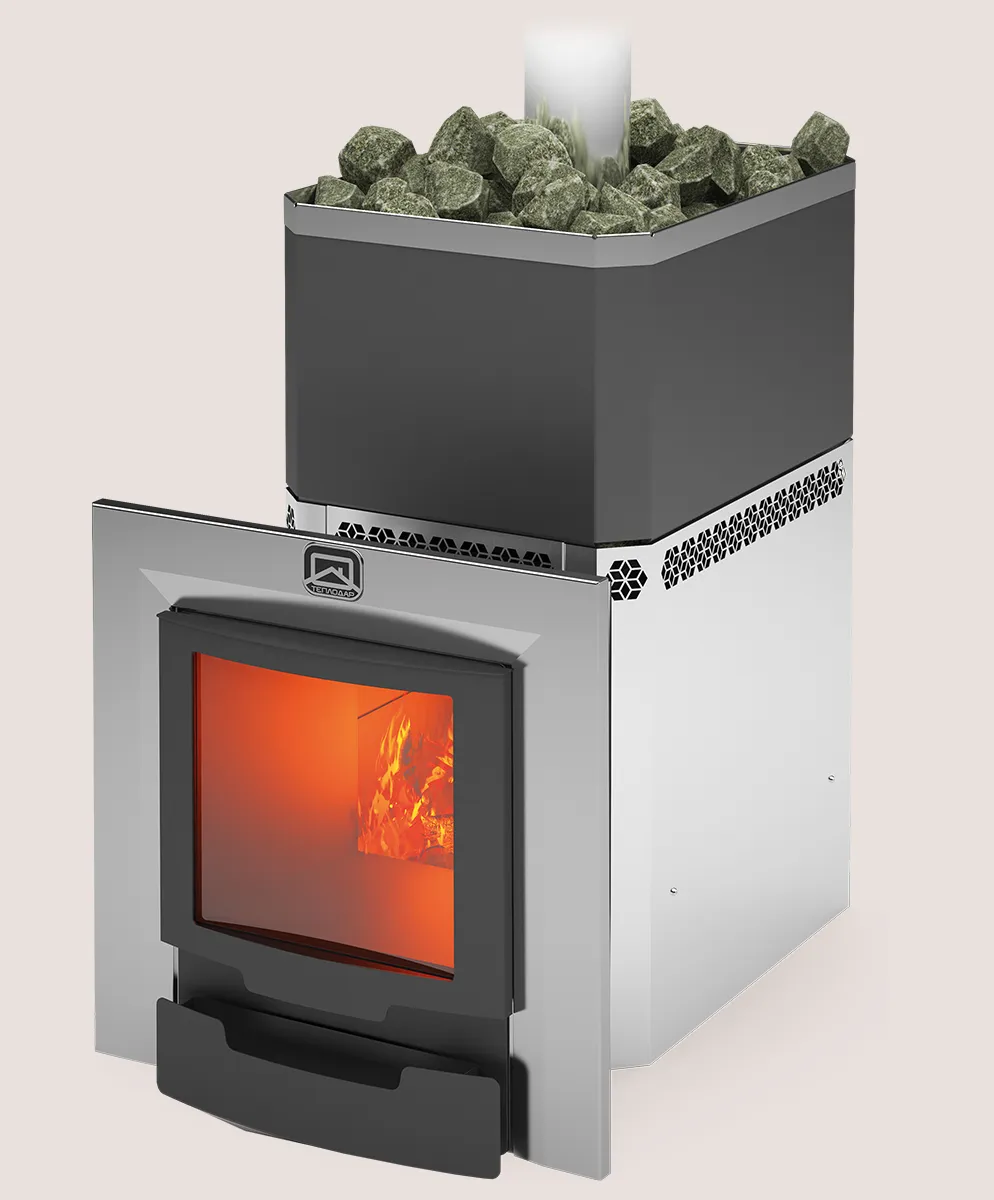 В корзине каменки камни выкладываются вокруг самого раскалённого элемента – дымосборника, - это обеспечивает качественный и равномерный прогрев камней. Большое количество нагретых камней, обеспечивает стабильность температуры в парилке. Выход дымовой трубы смещен от края к центру каменки, что значительно упрощает монтаж дымохода.