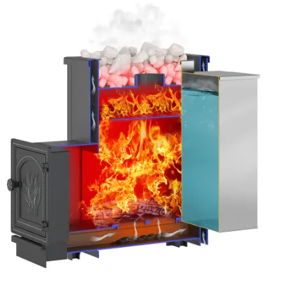 Конвекционный кожух обеспечивает активное движение воздуха и прогрев расчётного объёма парилки за минимальное время. Закладом камней в кожух организуют открытую каменку для получения плотного пара. В комплект поставки бак не входит и приобретается отдельно. При необходимости на печь можно установить два бака с двух боковых сторон печи. Бак поставляется отдельно.