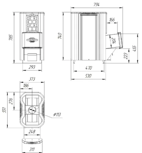 Каменка оснащена отверстиями для очистки дымосборника от сажи. Центральное расположение дымохода – для удобства монтажа.