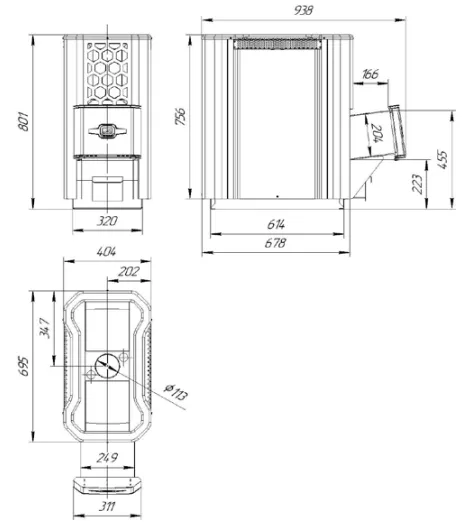 Каменка оснащена отверстиями для очистки дымосборника от сажи. Центральное расположение дымохода – для удобства монтажа.