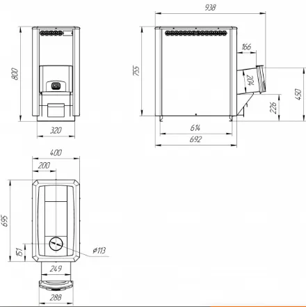 Камни в корзине каменки прогреваются с пяти сторон и дают много лёгкого пара. Выход дымохода у печи классический – смещенный к переднему краю печи. Такое расположение дымохода обеспечивает максимальный доступ к каменке.