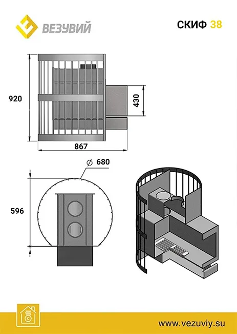 Сетка-конвектор вмещающий до 130 кг камней обеспечивает активное движение воздуха и прогрев расчётного объёма парилки за минимальное время. Закладом камней в кожух организуют открытую каменку для получения плотного пара.