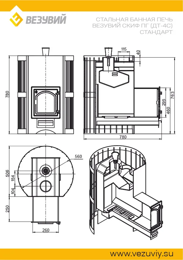 Печь Скиф устроена таким образом, что при заполнении сетки пар, получаемый в закрытой каменке, перегревается дважды: в самой закрытой каменке и после выхода, на камнях, размещённых в открытой части каменки. Чугунная дверь при нагревании не деформируется, сохраняет свою форму при остывании и предотвращает попадание продуктов горения на пол перед топкой. Печи Везувий Скиф оснащаются сетками для камней. Сетки сделаны из металлического прутка. В сетки по всей высоте укладываются камни для бани, обеспечивая большой объём заклада и длительное удержание тепла после прогрева каменки.