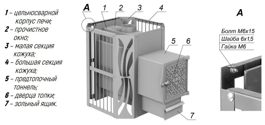 Для нагрева воздуха используются камни, уложенные вокруг топки и окруженные металлическим кожухом (сборным секционным ограждением). Для нагрева воды на дымоход устанавливается металлический бак либо теплообменник (в комплектацию печи не входят). Наличие выносного предтопочного тоннеля предусматривает установку печи в парильном помещении, с выходом топки в смежное помещение.