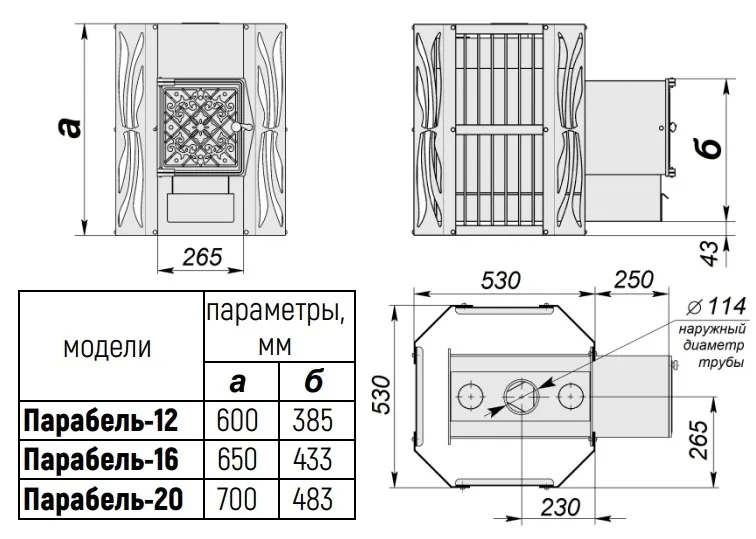 Печи банные «Парабель» являются нагревательным устройством конвекционного типа и рассчитаны на использование в частных банях в некоммерческих целях. Печи работают на твердом топливе (сухие дрова, древесные брикеты) и предназначены для нагрева воздуха до 110 °С и получения сухого или влажного пара.